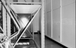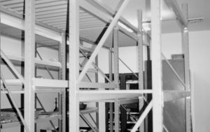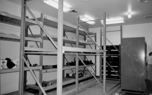 Standing at entrance (Southwest), looking Northeast across center racks during installation Lincoln Home NHS, CRS Collection Move, Facing Northeast Wall, Roll N10, exp 15 sheet 4 of 7 Arnold Barn, storage, artifacts