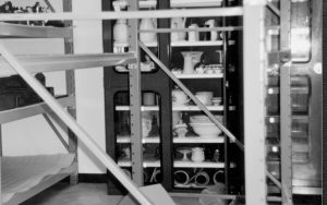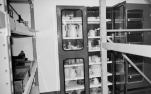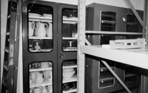Gray case (ceramics) with artifacts installed Lincoln Home NHS, CRS Collection Move, East Wall, Roll N10, exp 14 sheet 4 of 7 Arnold Barn, storage, artifacts