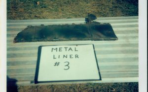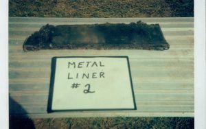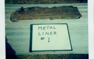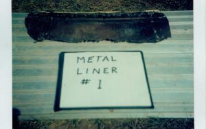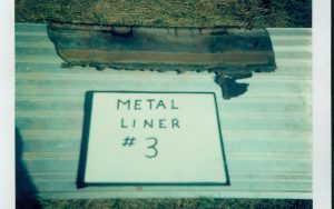 Under view of metal liner #1 shows brown paint that was used to under coat the metal before installation. P-22 Miller House, Metal Liner Under view of metal liner #1 shows brown paint that was used to under coat the metal before installation. P-22 Miller House, Metal Liner
