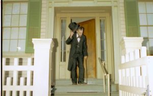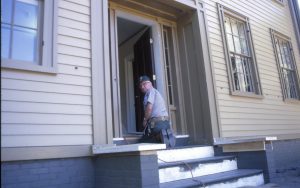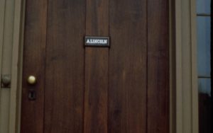 Lincoln impersonator exiting from front door of Lincoln home. Lincoln Home NHS- Coast Guard Band Concert concert, Coast Guard Lincoln impersonator exiting from front door of Lincoln home. Lincoln Home NHS- Coast Guard Band Concert concert, Coast Guard