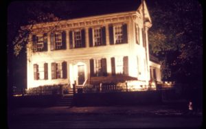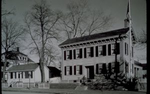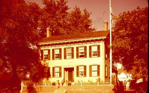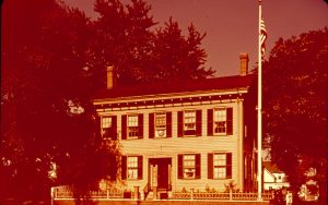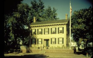 Lincoln Home front (West) elevation. A white picket fence surround the front of the Home. Boxwood bushes line front. Front door is painted same green as shutters. Large tree is visible on right. Corneau House is visible on left. Paint looks faded. Looking East/Northeast from ladder(?) at 8th and Jackson Street intersection. Lincoln Home, Corneau,…
