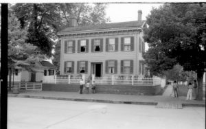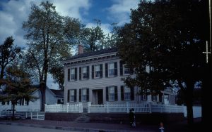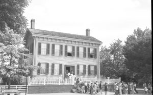 Lincoln Home front (West) elevation with visitors lining up to go inside. A ranger in ranger hat is visible in line-break on brick plaza. Another ranger with no hat is standing to the right of the open front door. Window are open on the second floor in the center and far right. A bench circles…