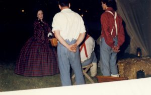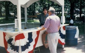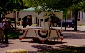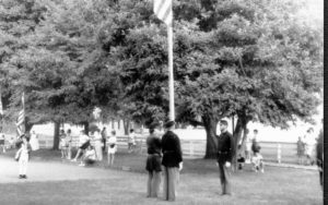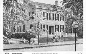 Lincoln Home west (front) elevation in official press photo. Features visitors walking past house and other visitor near a lawn chair on left. Flagpole behind picket fence in corner. Square commemorative plaques on either side of gate. DOI seal and NPS arrowhead are printed below photo on either side. Additional information IDs photo as being…