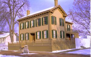 Lincoln Home west (front) elevation in winter, with flagpole in corner behind picket fence in corner. Lincoln Barn visible behind Home on right, Corneau house on left. Square commemorative plaques on either side of open gate. House appears to be painted white. Street light in foreground right. Looking East/Northeast from west side of 8th Street.…