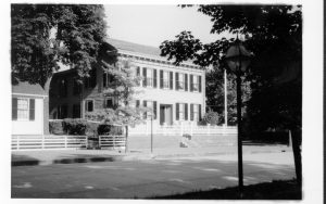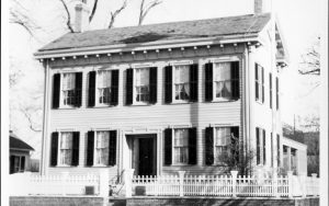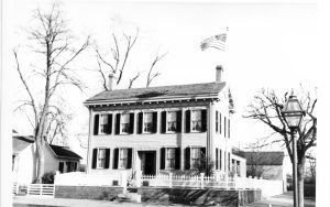 Lincoln Home west (front) elevation. Corneau House on far left. Lincoln Barn just visible behind Lincoln Home on far right. Square commemorative plaques on either side of open gate. House appears to be painted white. Looking East/Northeast from 8th Street Lincoln Home, Corneau, Lincoln Barn, painted white