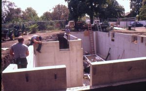 Morse - basement excavation, Walls poured. Maintenance Workers Sam Blasingame and ? and ? break out forms. Maintenance worker Tom Melton? lays pipe on floor. Cushmans and backhoe in background. Looking South from Morse Lot (Block 10, Lots 15-16) Morse, foundation, walls, staff, cushman, backhoe