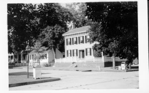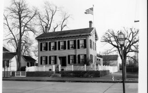 Lincoln Home west (front) elevation with flag pole on corner behind white picket fence. Lincoln Barn visible behind on right. Corneau House visible on left with two-story home on Bugg Lot (Block 10, Lot 5) on far left. Paved street, fire hydrant on corner near street. Square commemorative plaques visible on either side of gate…