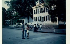 Visitors in front of Lincoln Home, talking to ranger? at top of stairs, near sunset. Bikes lean against street light on left near Corneau House. Two-story house visible on Bugg Lot (Block 10, Lot 5) on far left. Paved 8th Street with a ramp leading from brick plaza in front of Home. Fire hydrant visible…
