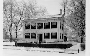 Lincoln Home west (front) elevation in winter, with flagpole on corner behind picket fence. Fire hydrant visible on corner of brick plaza. Two story houses visible on Bugg lot (Block 10, Lot 5) on left, and behind Home on Kercheval lot (Block 10, lot 9) in background right. Back porch is screened in. Looking Northeast…