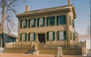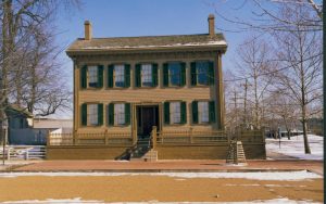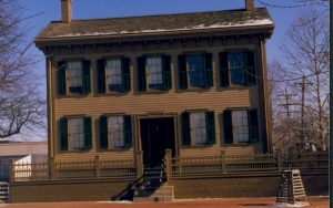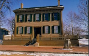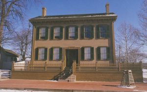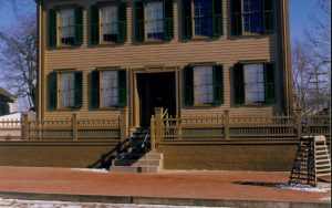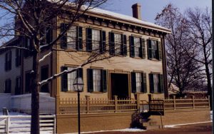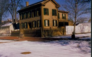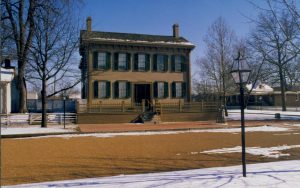 Lincoln Home in winter with some snow, cleared brick plaza, elm tree in cage on right. Corneau House is on left. Lincoln Barn is in the background on the far right. Looking East/Northeast from the 8th and Jackson Streets intersection snow, Lincoln Home, Corneau, Lincoln Barn, 8th Street, brick plaza, elm tree
