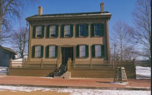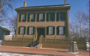 Lincoln Home in winter with some snow, cleared brick plaza in front, elm tree in cage on right. Corneau House on left. Cleared boardwalk on right. Looking East from 8th Street. snow, Lincoln Home, Corneau, brick plaza, elm tree, boardwalk, 8th Street