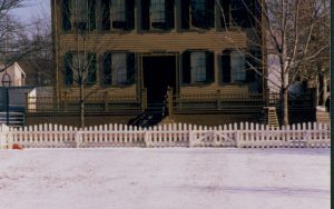 Lincoln Home in winter with some snow, cleared brick plaza in front, elm tree in cage on right. Corneau House on far left. Looking East from 8th Street snow, Lincoln Home, Corneau, 8th Street, brick plaza, elm tree