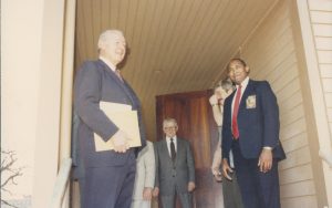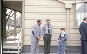 Two men standing with a boy back of home. Lincoln Home NHS- Paul Findley Recognition Award Finley, award, tour Two men standing with a boy back of home. Lincoln Home NHS- Paul Findley Recognition Award Finley, award, tour