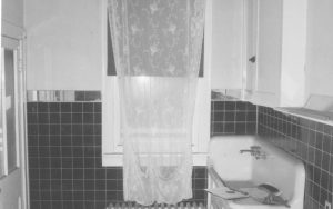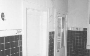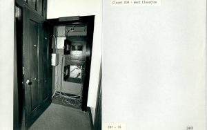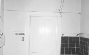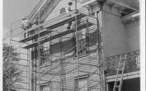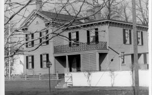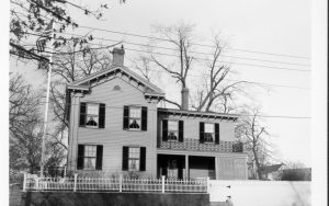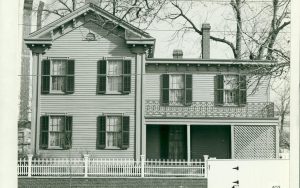 Lincoln Home - South elevation with flagpole behind the fence on the corner. B-2 visible behind the white fence in background right. Morse House (?) in far background right. Looking north from Jackson Street Lincoln Home, fences, flagpole, B-2, Morse, Jackson Street, utility lines