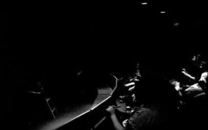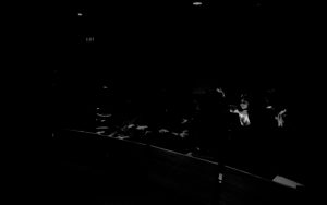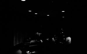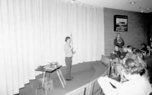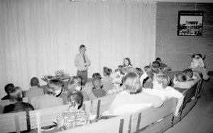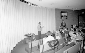 Lincoln's Birthday - Ranger Christy Lindberg leads a discussion following the movie, Abe Lincoln in Illinois with crowd in Theater 2 in Visitor Center. Looking Southwest from side of Theater 2 Lincoln's Birthday, staff, visitors, movie, Theater 2, Visitor Center