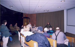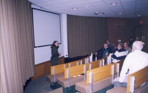 Lincoln's Birthday - Ranger Christy Lindberg leads a discussion following the movie, Abe Lincoln in Illinois in Theater 2 of Visitor Center. Crowd listens. Looking Northwest from back of Theater 2 Lincoln's Birthday, staff, visitors, Theater 2, Visitor Center