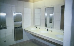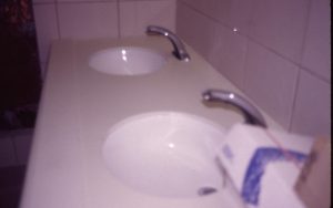 Visitor Center - remodeling, sinks/countertop closeup (photo blurry). Automatic start faucets over white sinks incorporated into the countertop. Other equipment in boxes on far right. Tile wall visible. Looking South from Women's Restroom Visitor Center, remodel, restroom, sinks, tile