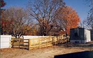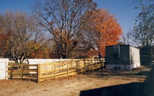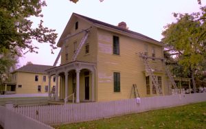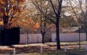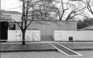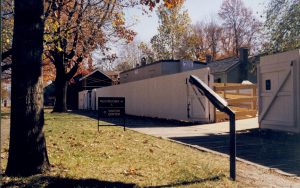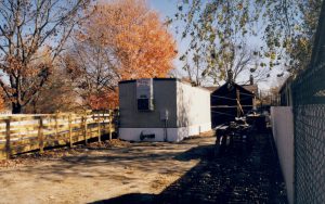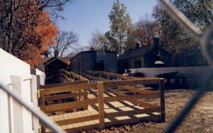 Temporary restroom trailer in use while Visitor Center was remodeled. Located in the Corneau lot (Block 6, Lot 16). Wheelchair access ramp goes off decking to right, steps come down front to another access ramp into Jackson Street. Corneau House (under restoration) on far left. Sprigg House in background left. Maintenance shed on background far…
