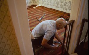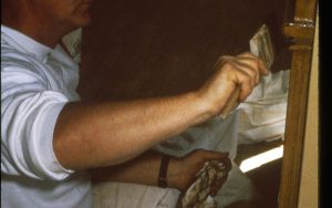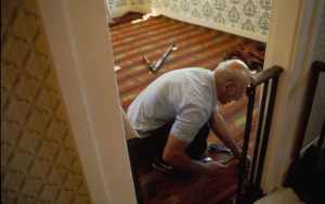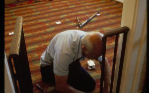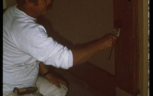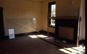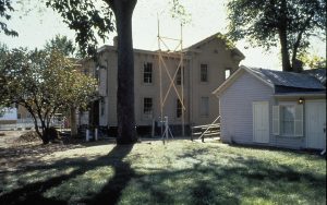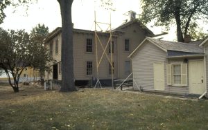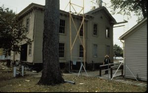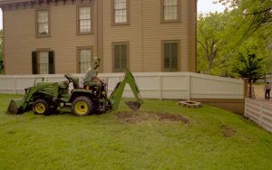 Tree removal - Maintenance worker Joe Beeley starts to dig a hole for new tree to plant replacement tree after hollow Linden tree was removed in Carrigan lot (Block 10 Lot 7). Hollow Linden in background right. JC Clark walks away in background far right. Lincoln Home in background. Looking South from Carrigan lot Linden, removal, replanting, staff, Lincoln Home, Carrigan