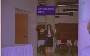 Lady standing in front of pillar 4-1997 Colloq (color); 18 Colloquium, 1997 Lady standing in front of pillar 4-1997 Colloq (color); 18 Colloquium, 1997