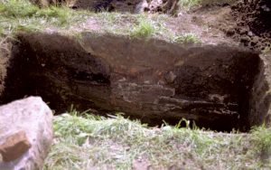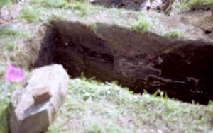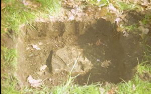 Exploratory excavations; photo taken looking West/Southwest along South fenceline of property (Mansberger, Smith, Blake) Lincoln Home NHS, Roll N6, Sheet 1 of 2 Arnold House and Property, exp 27 Arnold, privy excavation