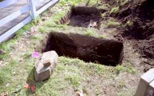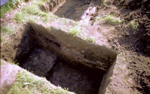 Mansberger excavation, uncovered pier/foundation while searching for 1880s barn; appears to be associated with later structure. Photo taken looking East along North side of property line Lincoln Home NHS, Roll N6, Sheet 1 of 2 Arnold House and Property, exp 18 excavation, barn, Corneau, foundation