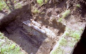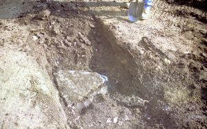 Mansberger excavation, uncovered pier/foundation while searching for 1880s barn; appears to be associated with later structure. Photo taken looking East along North side of property line Lincoln Home NHS, Roll N6, Sheet 1 of 2 Arnold House and Property, exp 20 excavation, barn, Corneau, foundation
