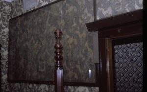 North room (entryway)- Looking towards West wall. North entrance door (not visible) at right of photo; basement entrance at left (can see stairs running down) Lincoln Home NHS, Roll N6 sheet 1 of 2, Arnold House and Propety, exp 7 (6) renovation, Corneau, entryway