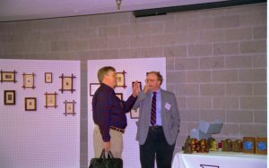 Two men talking in front of pictures hanging on peg board. 4-1997 Colloq (color); 5 Colloquium, 1997 Two men talking in front of pictures hanging on peg board. 4-1997 Colloq (color); 5 Colloquium, 1997