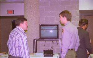 Two men talking in front of TV monitor. 4-1997 Colloq (color); 11 Colloquium, 1997 Two men talking in front of TV monitor. 4-1997 Colloq (color); 11 Colloquium, 1997