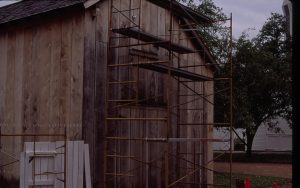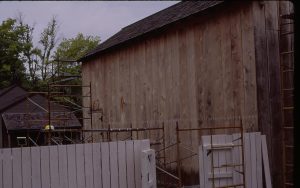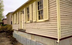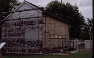 East wall, Northeast corner- Photos taken looking South along East external wall; Northeast corner at right of photo. Foundation (pre-brick) clearly seen at bottom of photo. Lincoln Home NHS, Roll N6 sheet 1 of 2, Arnold House and Propety, exp 9 (8) renovation, Corneau, entryway