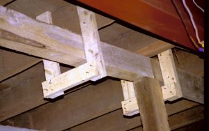 Basement- Detail of floor joists supporting the first floor; looking up from the basement Lincoln Home NHS, Roll N6 sheet 1 of 2, Arnold House and Propety, exp 4 (3) renovation, Corneau, basement