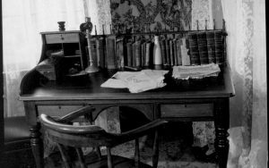 Mrs. Lincoln's Bedroom Lincoln Home, Mrs. Lincoln bedroom, table, books, papers, glasses Mrs. Lincoln's Bedroom Lincoln Home, Mrs. Lincoln bedroom, table, books, papers, glasses