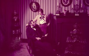 Mr. and Mrs. Lincoln impersonators in front parlor. Lincoln Home NHS- McCalls pictures 1957, 8-11+ Lincoln, McCalls, parlor, furnishings Mr. and Mrs. Lincoln impersonators in front parlor. Lincoln Home NHS- McCalls pictures 1957, 8-11+ Lincoln, McCalls, parlor, furnishings