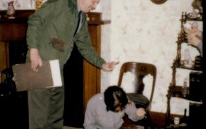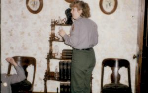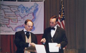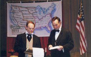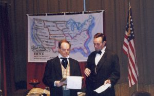 Fritz Klein and Drew Gibson in discussion in front of U.S. map. Lincoln Home NHS- Fritz Klein and Drew Gibson visit, roll 2002-1, exp 11 Klein, Gibson, visit