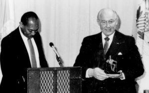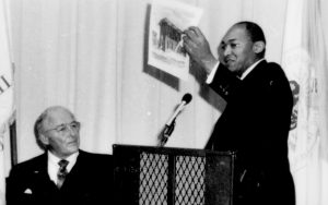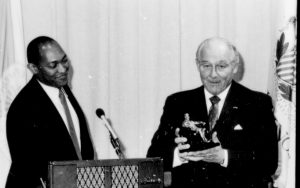 Two men standing, one holding seated Lincoln statute. Lincoln Home NHS- Paul Findley and Michel VIP visit, 125 Finley, Michel, visit, program Two men standing, one holding seated Lincoln statute. Lincoln Home NHS- Paul Findley and Michel VIP visit, 125 Finley, Michel, visit, program
