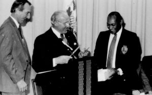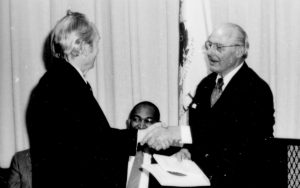 Two men shaking hands, one holding booklet. Lincoln Home NHS- Paul Findley and Michel VIP visit, 126 Finley, Michel, visit, program Two men shaking hands, one holding booklet. Lincoln Home NHS- Paul Findley and Michel VIP visit, 126 Finley, Michel, visit, program