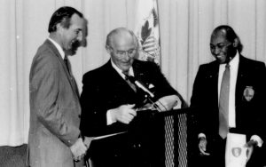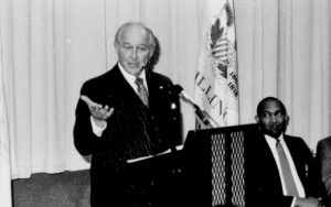 Three men standing at speakers podium. Lincoln Home NHS- Paul Findley and Michel VIP visit, 125 Finley, Michel, visit, program Three men standing at speakers podium. Lincoln Home NHS- Paul Findley and Michel VIP visit, 125 Finley, Michel, visit, program