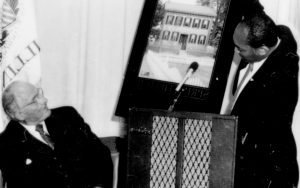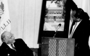 Two men looking at large picture of Lincoln Home. Lincoln Home NHS- Paul Findley and Michel VIP visit, 126 Finley, Michel, visit, program Two men looking at large picture of Lincoln Home. Lincoln Home NHS- Paul Findley and Michel VIP visit, 126 Finley, Michel, visit, program