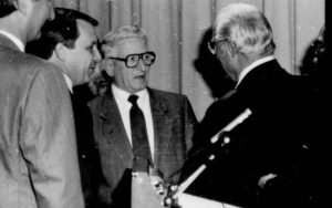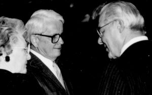 Three men standing, talking. Lincoln Home NHS- Paul Findley and Michel VIP visit, 125 Finley, Michel, visit, program Three men standing, talking. Lincoln Home NHS- Paul Findley and Michel VIP visit, 125 Finley, Michel, visit, program