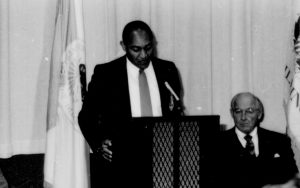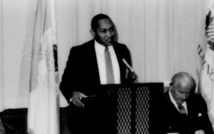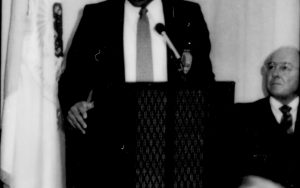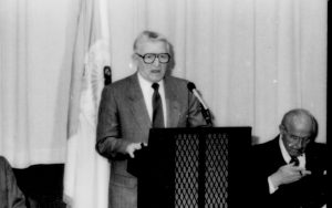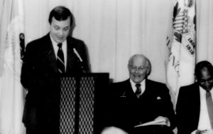 One man speaking, one seated listening. Lincoln Home NHS- Paul Findley and Michel VIP visit, 125 Finley, Michel, visit, program One man speaking, one seated listening. Lincoln Home NHS- Paul Findley and Michel VIP visit, 125 Finley, Michel, visit, program