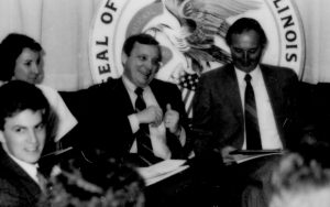 Four people sitting in front of state seal. Lincoln Home NHS- Paul Findley and Michel VIP visit, 125 Finley, Michel, visit, program Four people sitting in front of state seal. Lincoln Home NHS- Paul Findley and Michel VIP visit, 125 Finley, Michel, visit, program