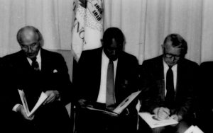 Three men seated looking at booklets. Lincoln Home NHS- Paul Findley and Michel VIP visit, 125 Finley, Michel, visit, program Three men seated looking at booklets. Lincoln Home NHS- Paul Findley and Michel VIP visit, 125 Finley, Michel, visit, program