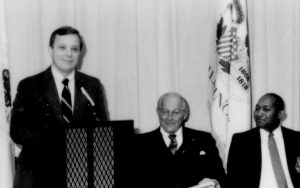 One man speaking, two seated listening. Lincoln Home NHS- Paul Findley and Michel VIP visit, 125 Finley, Michel, visit, program One man speaking, two seated listening. Lincoln Home NHS- Paul Findley and Michel VIP visit, 125 Finley, Michel, visit, program
