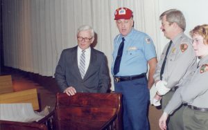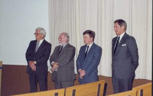 Four men standing in front of curtain. Lincoln Home NHS- Bring Furniture Back Home ceremony, presentation Four men standing in front of curtain. Lincoln Home NHS- Bring Furniture Back Home ceremony, presentation