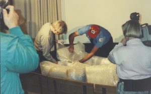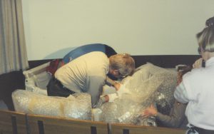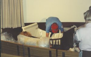 Man speaking in microphone, three un pack cradle. Lincoln Home NHS- Bring Furniture Back Home furniture, cradle Man speaking in microphone, three un pack cradle. Lincoln Home NHS- Bring Furniture Back Home furniture, cradle