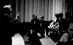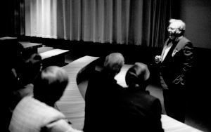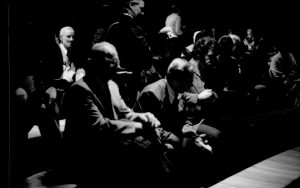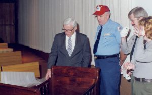 Visitors sitting on benches in theater. Lincoln Home NHS- Paul Findley visit to LIHO Finley, visit, banquet Visitors sitting on benches in theater. Lincoln Home NHS- Paul Findley visit to LIHO Finley, visit, banquet