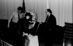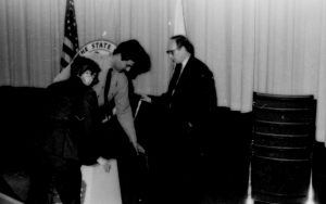 Ranger, man and woman in front of curtain. Lincoln Home NHS- Paul Findley and Michel VIP visit, 123 Finley, Michel, visit, reception Ranger, man and woman in front of curtain. Lincoln Home NHS- Paul Findley and Michel VIP visit, 123 Finley, Michel, visit, reception