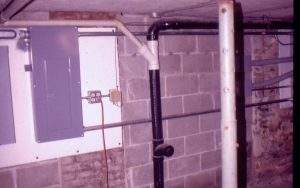 Lyon House - basement, PVC pipe in furnace room along back wall. Adjustable metal support in foreground right. Conduit, circuit break box and other utility equipment attached to back wall, a mix of old brick and modern cinder block. Floor is concrete. Wooden beam visible on ceiling with pipes and conduit running through it. This…
