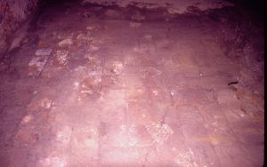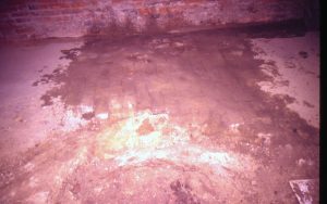 Lyon House - basement, brick pattern floor partially exposed near brick wall. Other flooring appears to be dirt and brick debris. Water stains from cleaning off brick floor. Looking East from basement Lyon, Basement, brick floor, brick wall